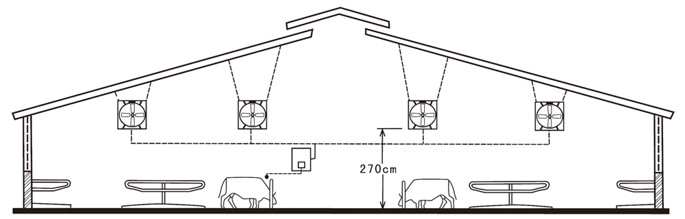 實驗證明,為了達到較好的通風效果,風機的安裝位置是牛棚料槽的正上方,風機下沿距離地面2.7米。傾斜角度在15到30度為佳。