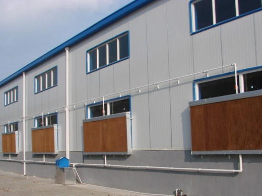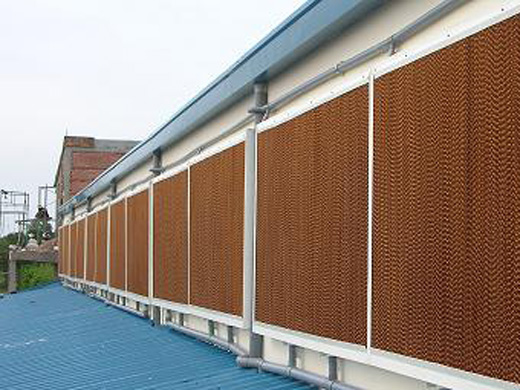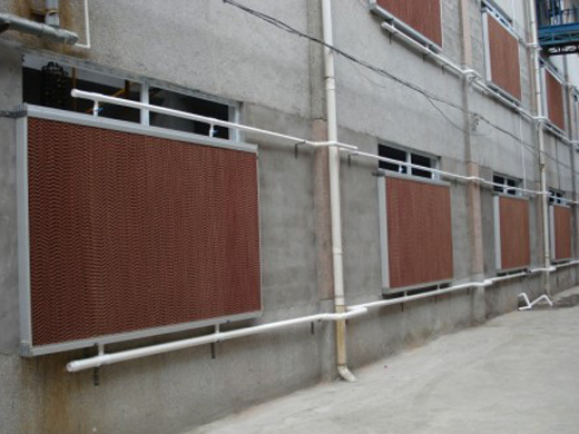 ZR濕簾降溫系統(tǒng)的降溫過(guò)程是在基核心-ZR紙墊內(nèi)完成的。在波紋的纖維紙表面有層薄薄的水膜,當(dāng)室外干熱空氣被風(fēng)機(jī)抽吸穿過(guò)紙墊時(shí),水膜上的水會(huì)吸收空氣中的熱量進(jìn)而蒸發(fā)在水蒸氣,這樣經(jīng)過(guò)處理后的涼爽濕潤(rùn)的空氣就進(jìn)入室內(nèi)了。這自然的過(guò)程猶如風(fēng)吹過(guò)水面一樣。